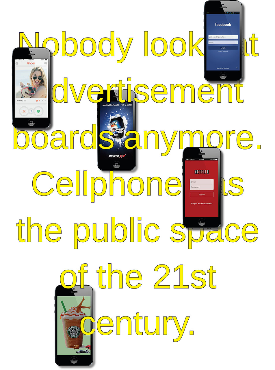 In the 80s, Jenny Holzer infiltrated advertisement boards to reflect on the life around her—but nobody looks at advertisement boards anymore. Nonetheless, we are being force-fed advertisement and propaganda on an unprecedented level.